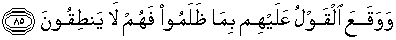 85. Dan jatuhlah perkataan (azab) atas mereka disebabkan kezaliman mereka, maka mereka tidak dapat berkata (apa-apa).