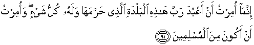 91. Aku hanya diperintahkan untuk menyembah Tuhan negeri ini (Mekah) Yang telah menjadikannya suci dan kepunyaan-Nya-lah segala sesuatu, dan aku diperintahkan supaya aku termasuk orang-orang yang berserah diri.