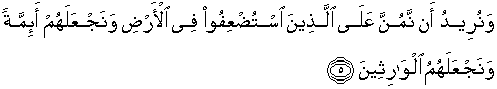 5. Dan Kami hendak memberi karunia kepada orang-orang yang tertindas di bumi (Mesir) itu dan hendak menjadikan mereka pemimpin dan menjadikan mereka orang-orang yang mewarisi (bumi)