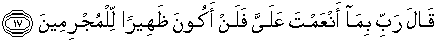 17. Musa berkata: "Ya Tuhanku, demi nikmat yang telah Engkau anugerah- kan kepadaku, aku sekali-kali tiada akan menjadi penolong bagi orang- orang yang berdosa."