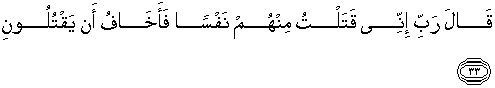 33. Musa berkata: "Ya Tuhanku sesungguhnya aku, telah membunuh seorang manusia dari golongan mereka, maka aku takut mereka akan membunuhku.