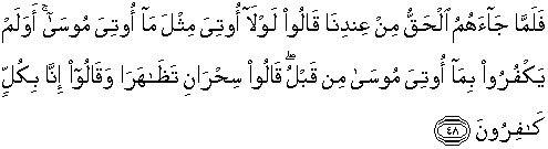 48. Maka tatkala datang kepada mereka kebenaran[1126] dari sisi Kami, me-
