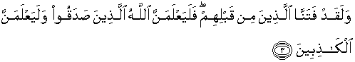 3. Dan sesungguhnya kami telah menguji orang-orang yang sebelum mereka, maka sesungguhnya Allah mengetahui orang-orang yang benar dan sesungguhnya Dia mengetahui orang-orang yang dusta.