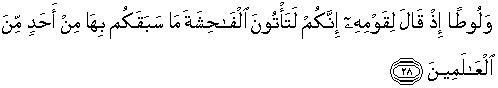 28. Dan (ingatlah) ketika Luth berkata pepada kaumnya: "Sesungguhnya kamu benar-benar mengerjakan perbuatan yang amat keji yang belum pernah dikerjakan oleh seorangpun dari umat-umat sebelum kamu."