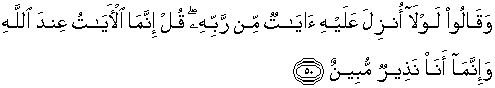 50. Dan orang-orang kafir Mekah berkata: "Mengapa tidak diturunkan kepadanya mukjizat-mukjizat dari Tuhannya?" Katakanlah: "Sesungguhnya mukjizat- mukjizat itu terserah kepada Allah. Dan sesungguhnya aku hanya seorang pemberi peringatan yang nyata."