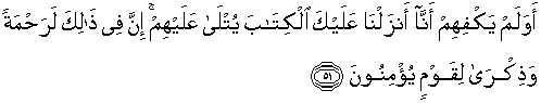 51. Dan apakah tidak cukup bagi mereka bahwasanya Kami telah menurunkan kepadamu Al Kitab (Al Quran) sedang dia dibacakan kepada mereka? Sesungguhnya dalam (Al Quran) itu terdapat rahmat yang besar dan pelajaran bagi orang-orang yang beriman.