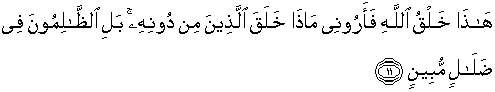 11. Inilah ciptaan Allah, maka perlihatkanlah olehmu kepadaku apa yang telah diciptakan oleh sembahan-sembahan(mu) selain Allah. Sebenarnya orang- orang yang zalim itu berada di dalam kesesatan yang nyata.