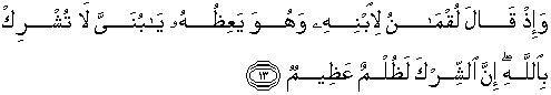 13. Dan (ingatlah) ketika Luqman berkata kepada anaknya, di waktu ia memberi pelajaran kepadanya: "Hai anakku, janganlah kamu mempersekutukan Allah, sesungguhnya mempersekutukan (Allah) adalah benar-benar kezaliman yang besar."