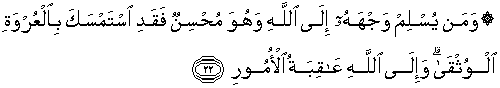 22. Dan barangsiapa yang menyerahkan dirinya kepada Allah, sedang dia orang yang berbuat kebaikan, maka sesungguhnya ia telah berpegang kepada buhul tali yang kokoh. Dan hanya kepada Allah-lah kesudahan segala urusan.