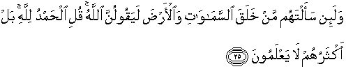 25. Dan sesungguhnya jika kamu tanyakan kepada mereka: "Siapakah yang menciptakan langit dan bumi?" Tentu mereka akan menjawab: "Allah." Katakanlah : "Segala puji bagi Allah"; tetapi kebanyakan mereka tidak mengetahui.