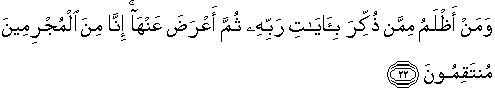 22. Dan siapakah yang lebih zalim daripada orang yang telah diperingatkan dengan ayat-ayat Tuhannya, kemudian ia berpaling daripadanya? Sesungguhnya Kami akan memberikan pembalasan kepada orang-orang yang berdosa.