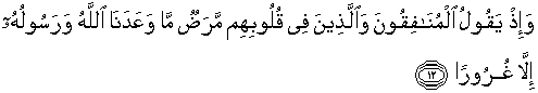 12. Dan (ingatlah) ketika orang-orang munafik dan orang-orang yang berpenyakit dalam hatinya berkata :"Allah dan Rasul-Nya tidak menjanjikan kepada kami melainkan tipu daya."