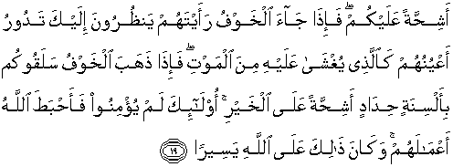 19. Mereka bakhil terhadapmu, apabila datang ketakutan (bahaya),