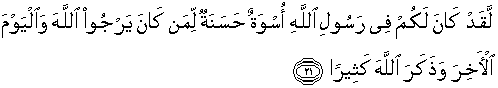 21. Sesungguhnya telah ada pada (diri) Rasulullah itu suri teladan yang baik bagimu (yaitu) bagi orang yang mengharap (rahmat) Allah dan (kedatangan) hari kiamat dan dia banyak menyebut Allah.