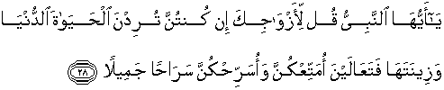 28. Hai Nabi, katakanlah kepada isteri-isterimu: "Jika kamu