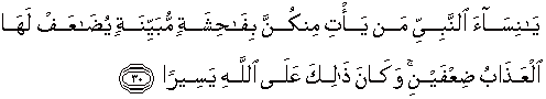 30. Hai isteri-isteri Nabi, siapa-siapa di antaramu yang mengerjakan perbuatan keji yang nyata, niscaya akan di lipat gandakan siksaan kepada mereka dua kali lipat. Dan adalah yang demikian itu mudah bagi Allah.
