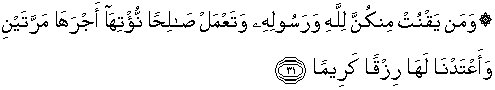 31. Dan barang siapa diantara kamu sekalian (isteri-isteri nabi) tetap taat kepada Allah dan Rasul-Nya dan mengerjakan amal yang saleh, niscata Kami memberikan kepadanya pahala dua kali lipat dan Kami sediakan baginya rezki yang mulia.