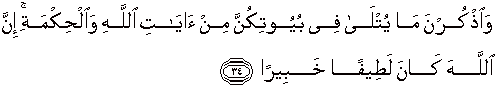 34. Dan ingatlah apa yang dibacakan di rumahmu dari ayat-ayat Allah dan hikmah (sunnah nabimu). Sesungguhnya Allah adalah Maha Lembut lagi Maha Mengetahui.