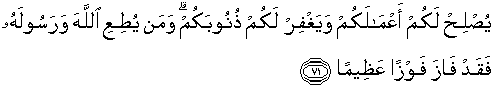 71. niscaya Allah memperbaiki bagimu amalan-amalanmu dan mengampuni bagimu dosa-dosamu. Dan barangsiapa mentaati Allah dan Rasul-Nya, maka sesungguhnya ia telah mendapat kemenangan yang besar.