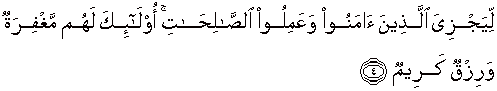 4. supaya Allah memberi balasan kepada orang-orang yang beriman dan mengerjakan amal yang saleh. Mereka itu adalah orang-orang yang baginya ampunan dan rezki yang mulia.