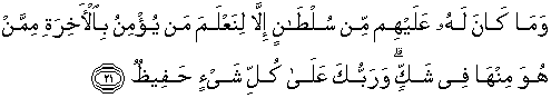 21. Dan tidak adalah kekuasaan iblis terhadap mereka, melainkan hanyalah agar Kami dapat membedakan siapa yang beriman kepada adanya kehidupan akhirat dari siapa yang ragu-ragu tentang itu. Dan Tuhanmu Maha Memelihara segala sesuatu.