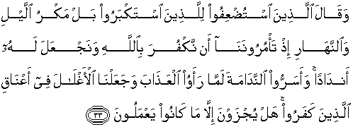 menyombongkan diri: "(Tidak) sebenarnya tipu daya(mu) di waktu malam dan siang (yang menghalangi kami), ketika kamu menyeru kami supaya
