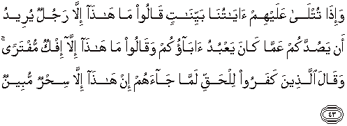 43. Dan apabila dibacakan kepada mereka ayat-ayat Kami yang terang, mereka berkata: "Orang ini tiada lain hanyalah seorang laki-laki yang