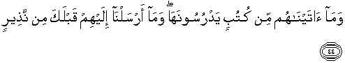 44. Dan Kami tidak pernah memberikan kepada mereka kitab-kitab yang mereka baca dan sekali-kali tidak pernah (pula) mengutus kepada mereka sebelum kamu seorang pemberi peringatanpun.