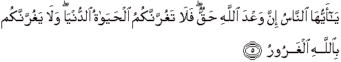 5. Hai manusia, sesungguhnya janji Allah adalah benar, maka sekali-kali janganlah kehidupan dunia memperdayakan kamu dan sekali-kali janganlah syaitan yang pandai menipu, memperdayakan kamu tentang Allah.