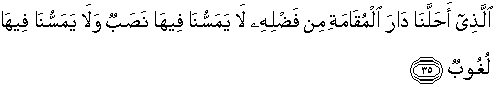 35. Yang menempatkan kami dalam tempat yang kekal (surga) dari karunia-Nya; didalamnya kami tiada merasa lelah dan tiada pula merasa lesu."
