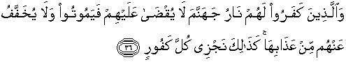 36. Dan orang-orang kafir bagi mereka neraka Jahannam. Mereka tidak dibinasakan sehingga mereka mati dan tidak (pula) diringankan dari mereka azabnya. Demikianlah Kami membalas setiap orang yang sangat kafir.