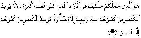 39. Dia-lah yang menjadikan kamu khalifah-khalifah di muka bumi. Barangsiapa yang kafir, maka (akibat) kekafirannya menimpa dirinya sendiri.