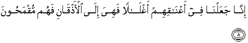8. Sesungguhnya Kami telah memasang belenggu dileher mereka, lalu tangan mereka (diangkat) ke dagu, maka karena itu mereka tertengadah.
