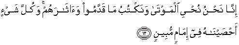 12. Sesungguhnya Kami menghidupkan orang-orang mati dan Kami menuliskan apa yang telah mereka kerjakan dan bekas-bekas yang mereka tinggalkan. Dan segala sesuatu Kami kumpulkan dalam Kitab Induk yang nyata (Lauh Mahfuzh).