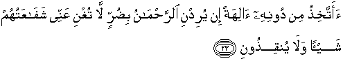 23. Mengapa aku akan menyembah tuhan-tuhan selain Nya jika (Allah) Yang Maha Pemurah menghendaki kemudharatan terhadapku, niscaya syafaat mereka tidak memberi manfaat sedikitpun bagi diriku dan mereka tidak (pula) dapat menyelamatkanku?