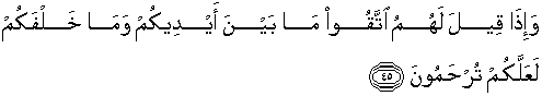 45. Dan apabila dikatakan kepada mereka: "Takutlah kamu akan siksa yang dihadapanmu dan siksa yang akan datang supaya kamu mendapat rahmat", (niscaya mereka berpaling).