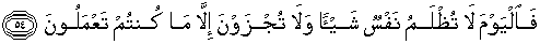 54. Maka pada hari itu seseorang tidak akan dirugikan sedikitpun dan kamu tidak dibalasi, kecuali dengan apa yang telah kamu kerjakan.