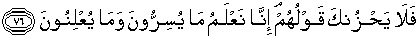 76. Maka janganlah ucapan mereka menyedihkan kamu. Sesungguhnya Kami mengetahui apa yang mereka rahasiakan dan apa yang mereka nyatakan.