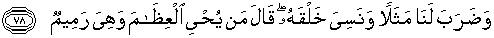 78. Dan ia membuat perumpamaan bagi Kami; dan dia lupa kepada kejadiannya; ia berkata: "Siapakah yang dapat menghidupkan tulang belulang, yang telah hancur luluh?"