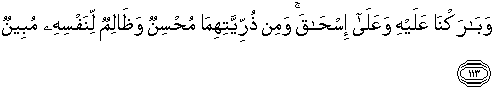 113. Kami limpahkan keberkatan atasnya dan atas Ishaq. Dan diantara anak cucunya ada yang berbuat baik dan ada (pula) yang Zalim terhadap dirinya sendiri dengan nyata.