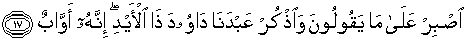 17. Bersabarlah atas segala apa yang mereka katakan; dan ingatlah hamba Kami Daud yang mempunyai kekuatan; sesungguhnya dia amat taat (kepada Tuhan).