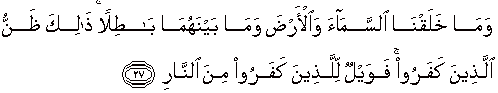 27. Dan Kami tidak menciptakan langit dan bumi dan apa yang ada antara keduanya tanpa hikmah. Yang demikian itu adalah anggapan orang-orang kafir, maka celakalah orang-orang kafir itu karena mereka akan masuk neraka.