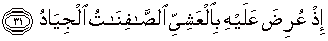 31. (ingatlah) ketika dipertunjukkan kepadanya kuda-kuda yang tenang di waktu berhenti dan cepat waktu berlari pada waktu sore,