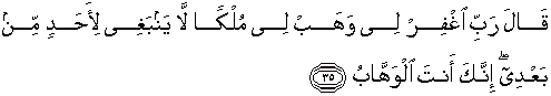 35. Ia berkata: "Ya Tuhanku, ampunilah aku dan anugerahkanlah kepadaku kerajaan yang tidak dimiliki oleh seorang juapun sesudahku, sesungguhnya Engkaulah Yang Maha Pemberi."