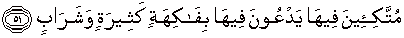 51. di dalamnya mereka bertelekan (diatas dipan-dipan) sambil meminta buah-buahan yang banyak dan minuman di surga itu.