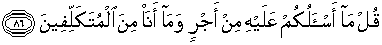 86. Katakanlah (hai Muhammad): "Aku tidak meminta upah sedikitpun padamu atas da'wahku dan bukanlah aku termasuk orang-orang yang mengada-adakan.