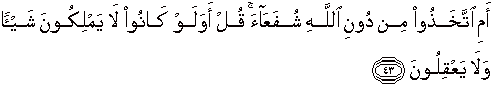 43. Bahkan mereka mengambil pemberi syafa'at selain Allah. Katakanlah: "Dan apakah (kamu mengambilnya juga) meskipun mereka tidak memiliki sesuatupun dan tidak berakal?"