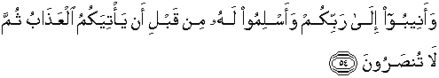 54. Dan kembalilah kamu kepada Tuhanmu, dan berserah dirilah kepada-Nya sebelum datang azab kepadamu kemudian kamu tidak dapat ditolong (lagi).