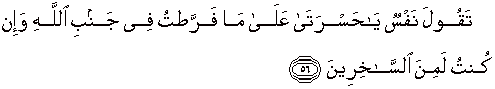 56. supaya jangan ada orang yang mengatakan: "Amat besar penyesalanku atas kelalaianku dalam (menunaikan kewajiban) terhadap Allah, sedang aku sesungguhnya termasuk orang-orang yang memperolok-olokkan (agama Allah ),