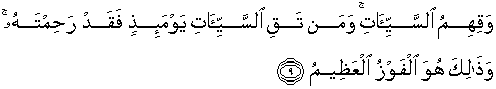 9. dan peliharalah mereka dari (balasan) kejahatan. Dan orang-orang yang Engkau pelihara dari (pembalasan) kejahatan pada hari itu maka sesungguhnya telah Engkau anugerahkan rahmat kepadanya dan itulah kemenangan yang besar."